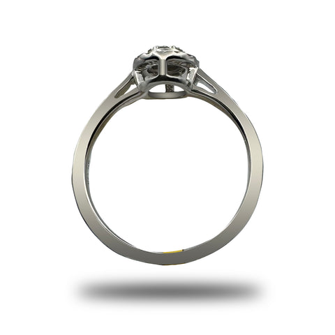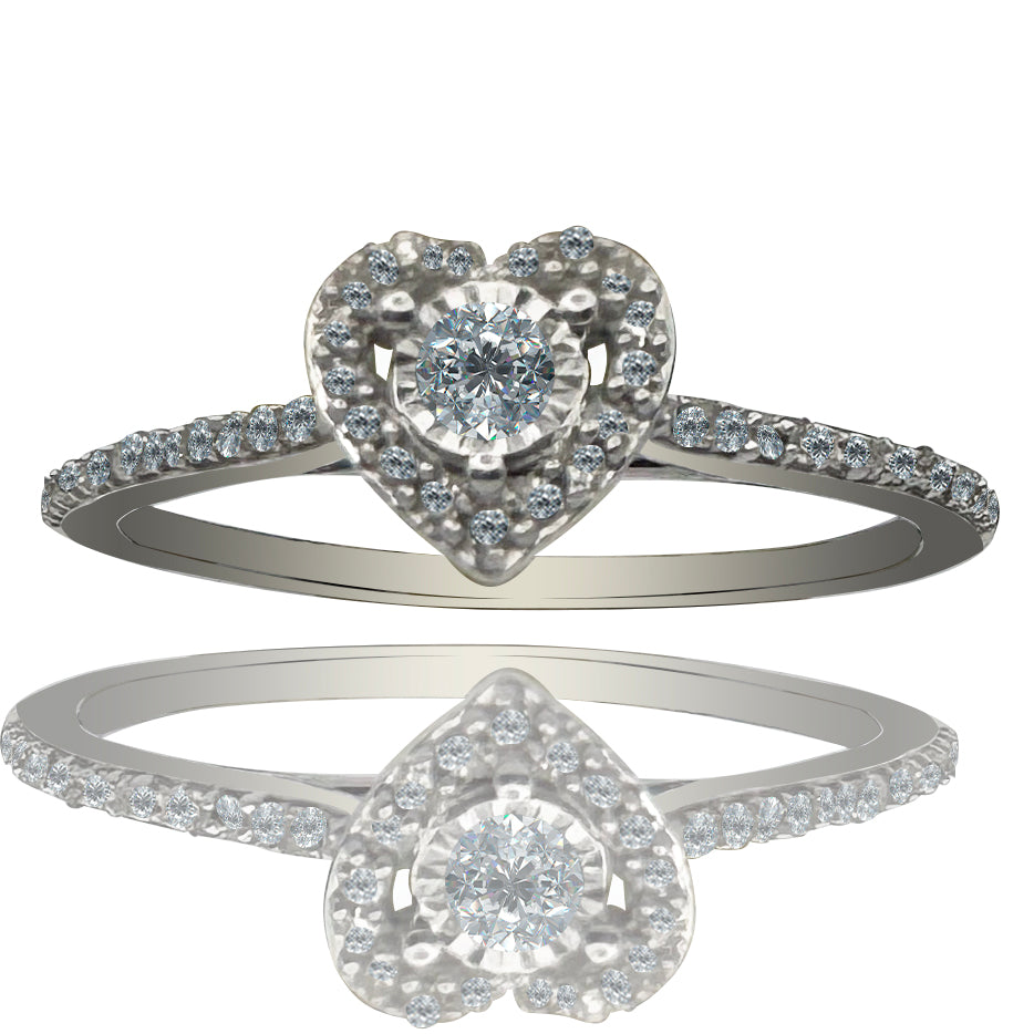 Este anillo de oro de 14 quilates con 0.15 quilates de diamante combina un montaje solitario tipo ilusión con un delicado canal en los laterales. Su diseño incorpora formas de corazón rodeadas de pequeños diamantes que aportan un detalle distintivo y refinado.
