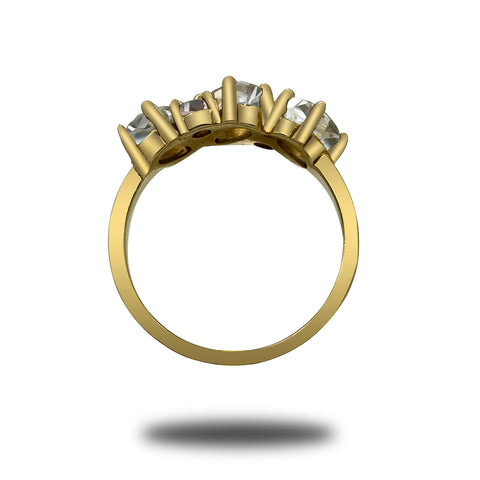 Este anillo de oro de 14 quilates con 1.20 quilates de morganita y 0.20 quilates de turmalina presenta morganitas ovaladas dispuestas en diagonal, acompañadas por una turmalina entre cada una.